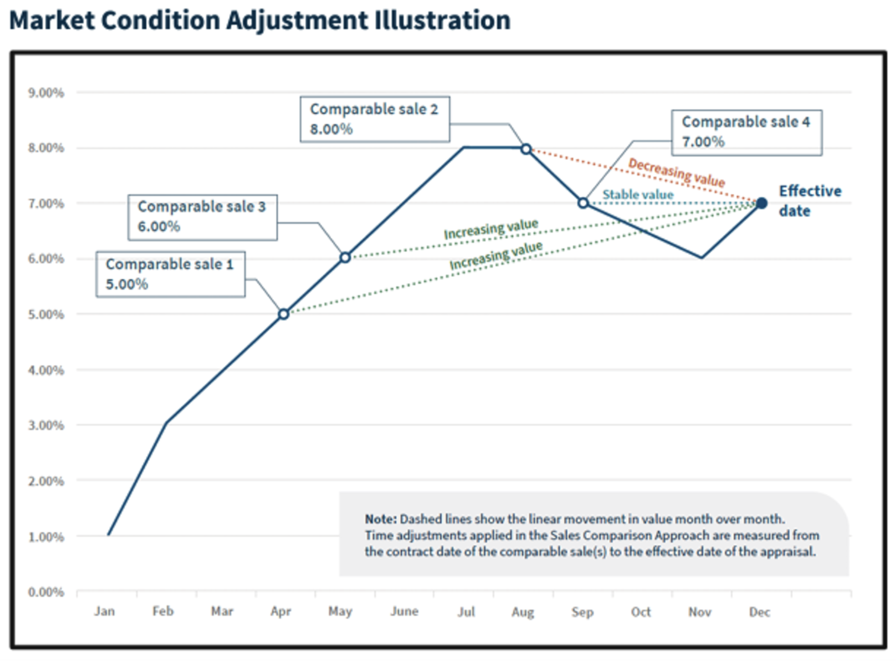 To illustrate how these two processes are embedded in the appraisal process, Fannie Mae has provided an example of a graph that captures a visual explanation of how the conclusions are applied for both the overall market trend (blue line) and the individual adjustment levels (callout data points) when applying adjustments in the Sales Comparison Approach.